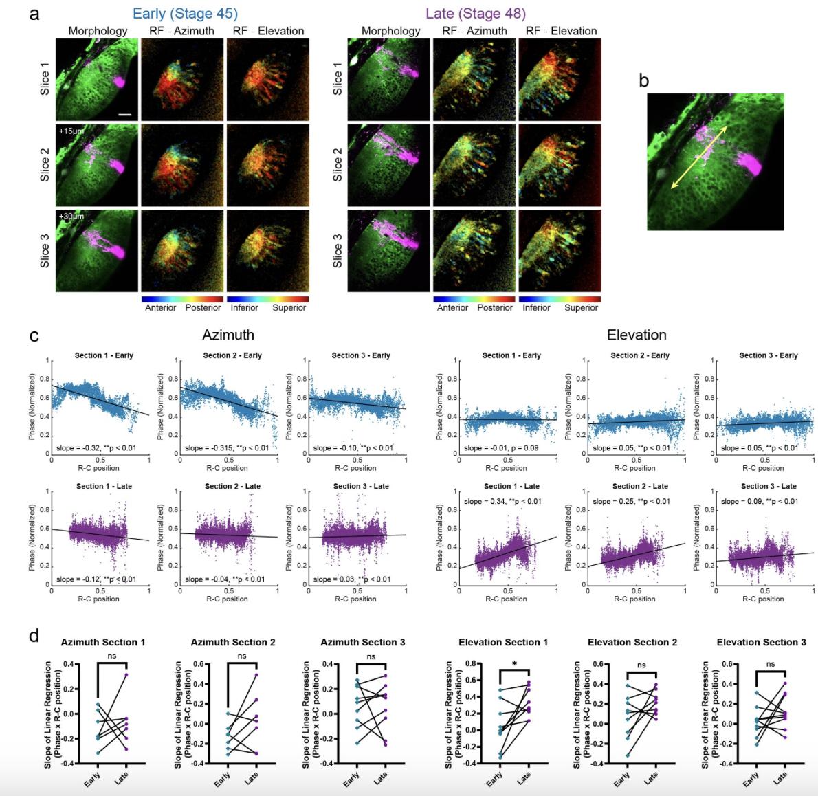 (a) Example images from one animal. Scale bar in upper left image is 40 μm. The three optical sections are spaced 15 μm in depth from each other, with Section 3 at the bottommost depth. In each row of 3 images for each optical section: (Left) Morphology of the tectum showing dextran-labelled cell. (Middle) Azimuth receptive field map (pixel intensities indicate SNR). (Right) Elevation receptive field map. (b) For each stage, the rostrocaudal axis of the neuropil of the center section, Section 2, was used as the reference R-C axis when quantifying the topographic gradients along the R-C axis. An R-C position of 0 is closest to the caudal edge of the neuropil, 1 is closest to the rostral end. (c) Distribution of receptive field phase values along the R-C axis for the example animal and optical sections shown in (a). Black line shows simple linear regressions fitted to the data. Phase values are scaled from the original range of [-pi, 0] to a range of [0, 1], therefore the range of the linear regression slope is [-1,1], and a slope of 1 or -1 indicates a topographic gradient that is perpendicular to the R-C axis. (d) Comparing slopes of linear regressions fitted to phase vs R-C position (n = 10 animals). Data for animals/sections where the linear regression wasn’t a good fit were excluded. Comparing slope values at early vs late stages yielded no significant direction of change for all cases except for the elevation gradients in Section 1, which showed a significant increase (Wilcoxon matched-pairs test, *p = 0.0273).
