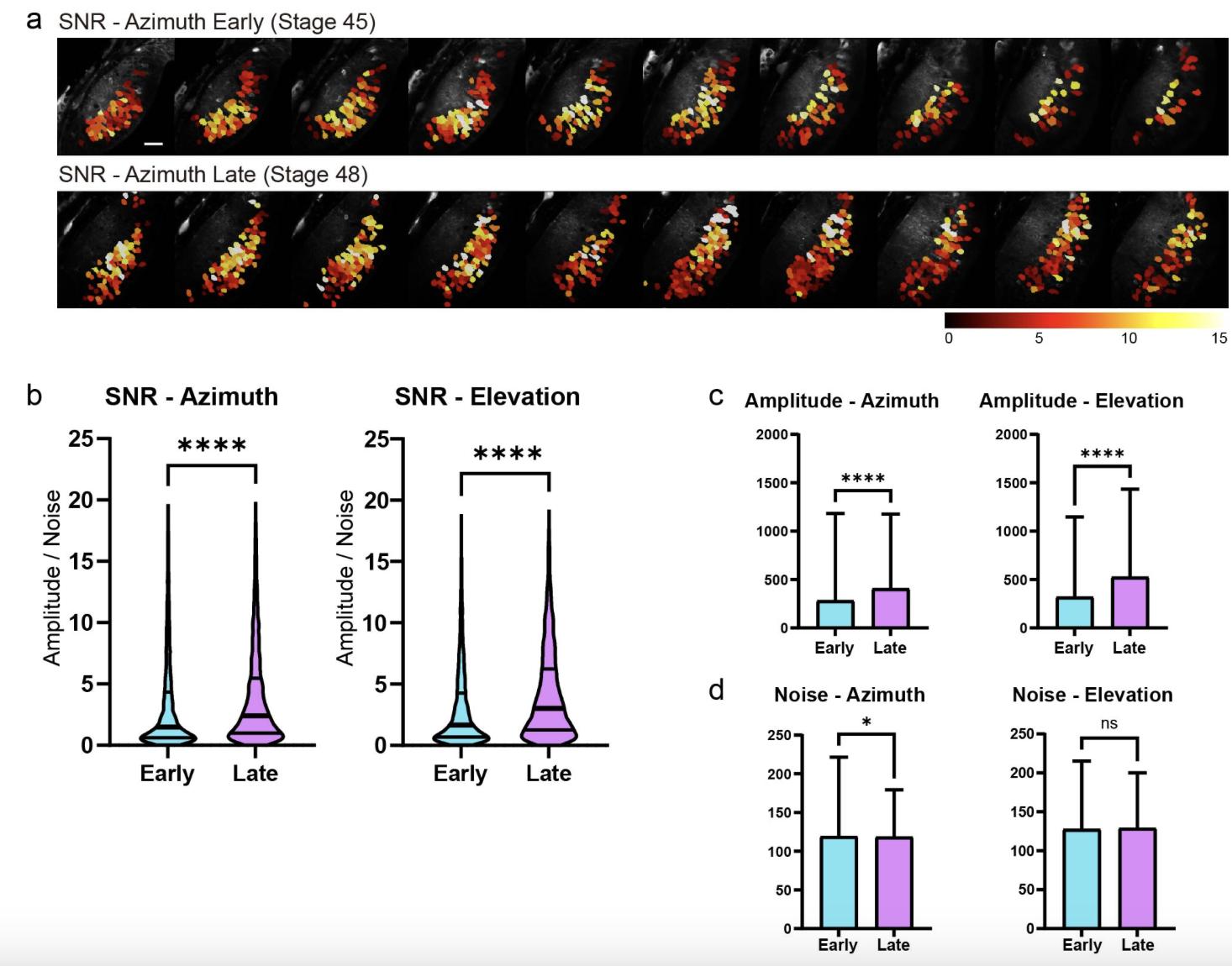 (a) SNR of cell body responses to drifting bars in the same animal at stage 45 and 48. Cell body ROIs are colored according to the SNR of their stimulus-evoked response. Only cells with SNR > 2 are shown. Scale bar is 40 μm. (b) SNR of cell body evoked responses to drifting bars at early (stage 45-46) and late (stage 48) stages, showing results from all cells pooled from 5 animals. All available cells were included in the analysis, including those with SNR ≤ 2. SNR was significantly higher at late stage for both azimuth and elevation (azimuth: nearly = 3679, nlate = 3781; elevation: nearly = 3633, nlate = 3886) (c) Median and 75th percentile of evoked response amplitudes from the cells in (b). Response amplitude is defined as the amplitude of the Fourier component at the stimulation frequency. Response amplitudes were significantly higher at late stage for both azimuth and elevation. (d) Median and 75th percentile of noise levels from the cells in (b). Noise level was calculated as the standard deviation of Fourier power at all frequencies above the stimulation frequency. Noise levels were slightly lower at late stage for azimuth, and not significantly different between early and late stages for elevation.