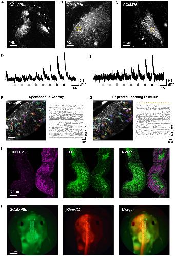 (G) (Left) Same two-photon optical section as shown in (F), overlaid with ROIs generated from Suite2P based on responses to a repeated looming stimulus (dark circle on a bright background expanding from small to large, displayed on a small LED screen positioned next to the right eye). (Right) Stimulus-evoked response traces extracted by Suite2P, each trace corresponding to a different ROI in the left panel. Top orange ticks denote the onset times of stimulus presentations (once every 6 seconds).