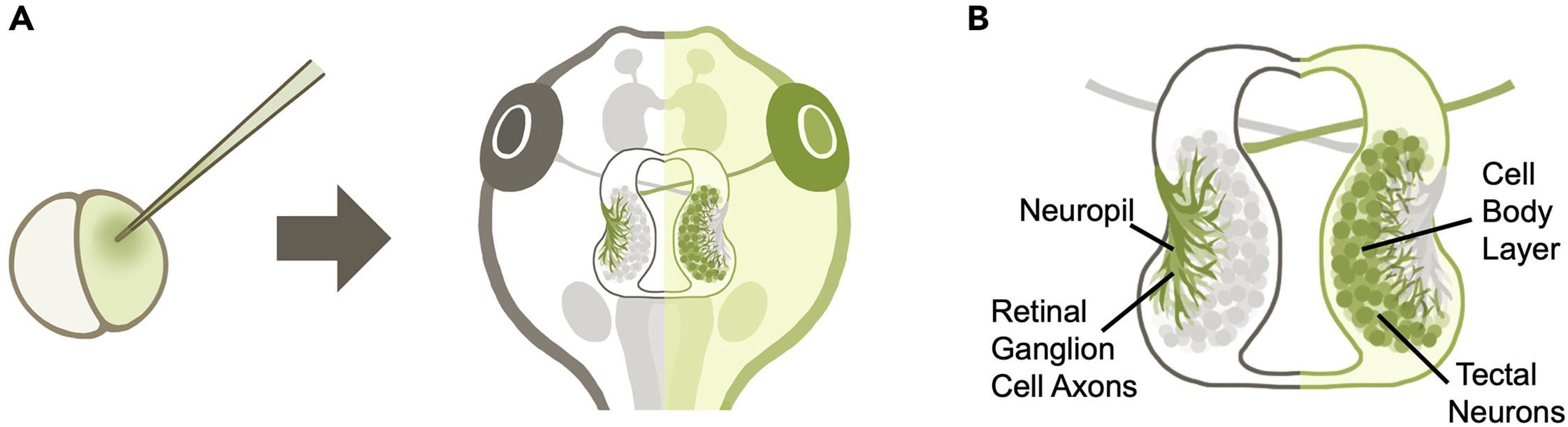 (B) Schematic of the tadpole retinotectal system. The tadpole tectum can be visually separated into two regions: the cell body layer mainly consisting of somata of tectal cells, and the neuropil layer mainly consisting of the dendrites of tectal neurons and the axon terminals of RGCs projecting in from the contralateral eye. Due to the crossing over of RGC axons, tadpoles with hemimosaic expression of fluorescent protein or morpholino will display fluorescent protein expression or morpholino knockdown in RGC axon terminals in one tectal hemisphere, and in tectal neurons in the opposite hemisphere. |