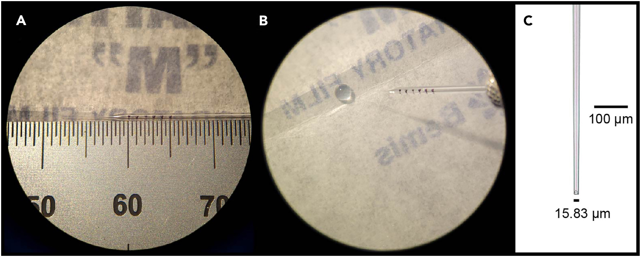 (C) Closeup image of the tip of a calibrated pipette. |