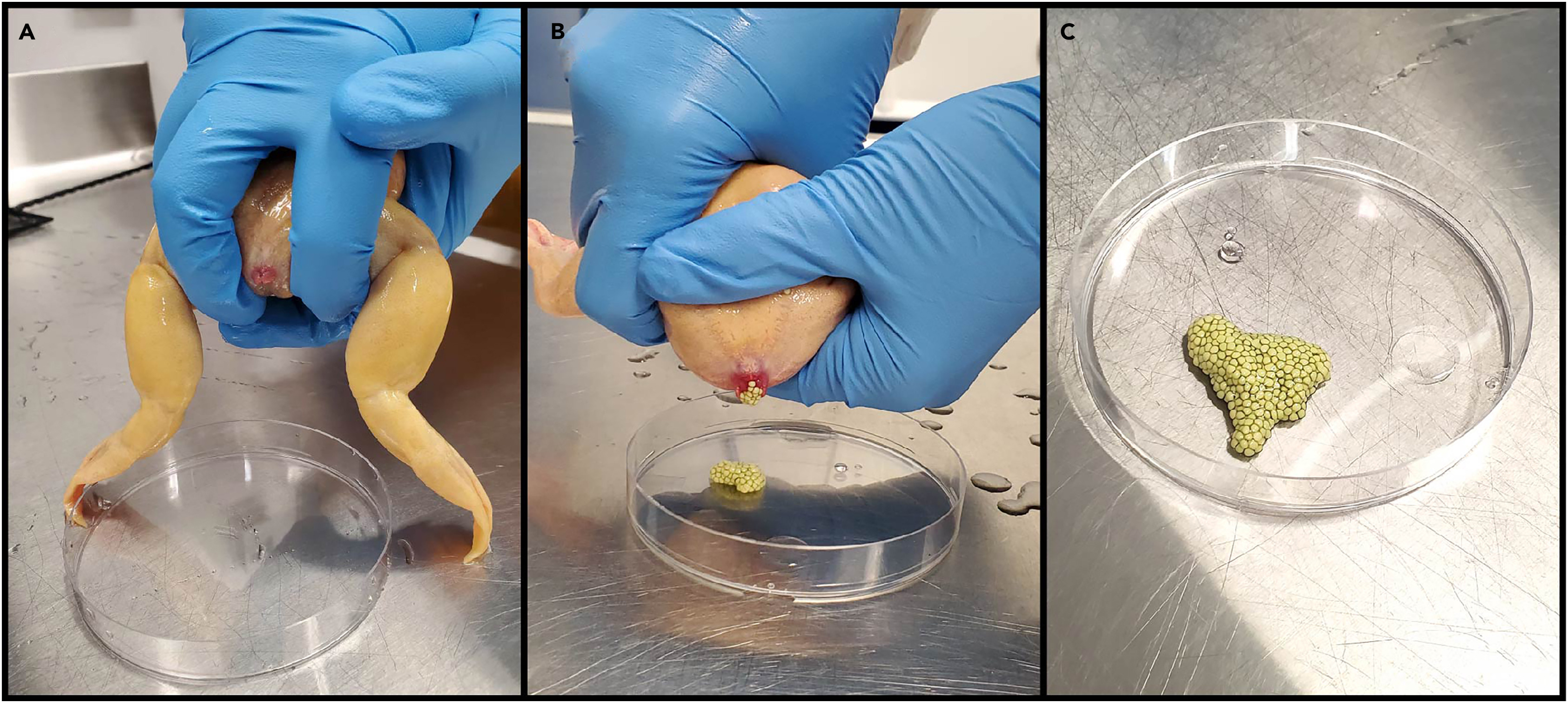 (A) Hold the frog with your dominant hand, using your other hand to help support the frog’s belly. Spread the frog’s hind legs with your index and middle finger to expose the cloaca, and massage the frog’s back and belly from the sacrum towards the cloaca to facilitate egg release.