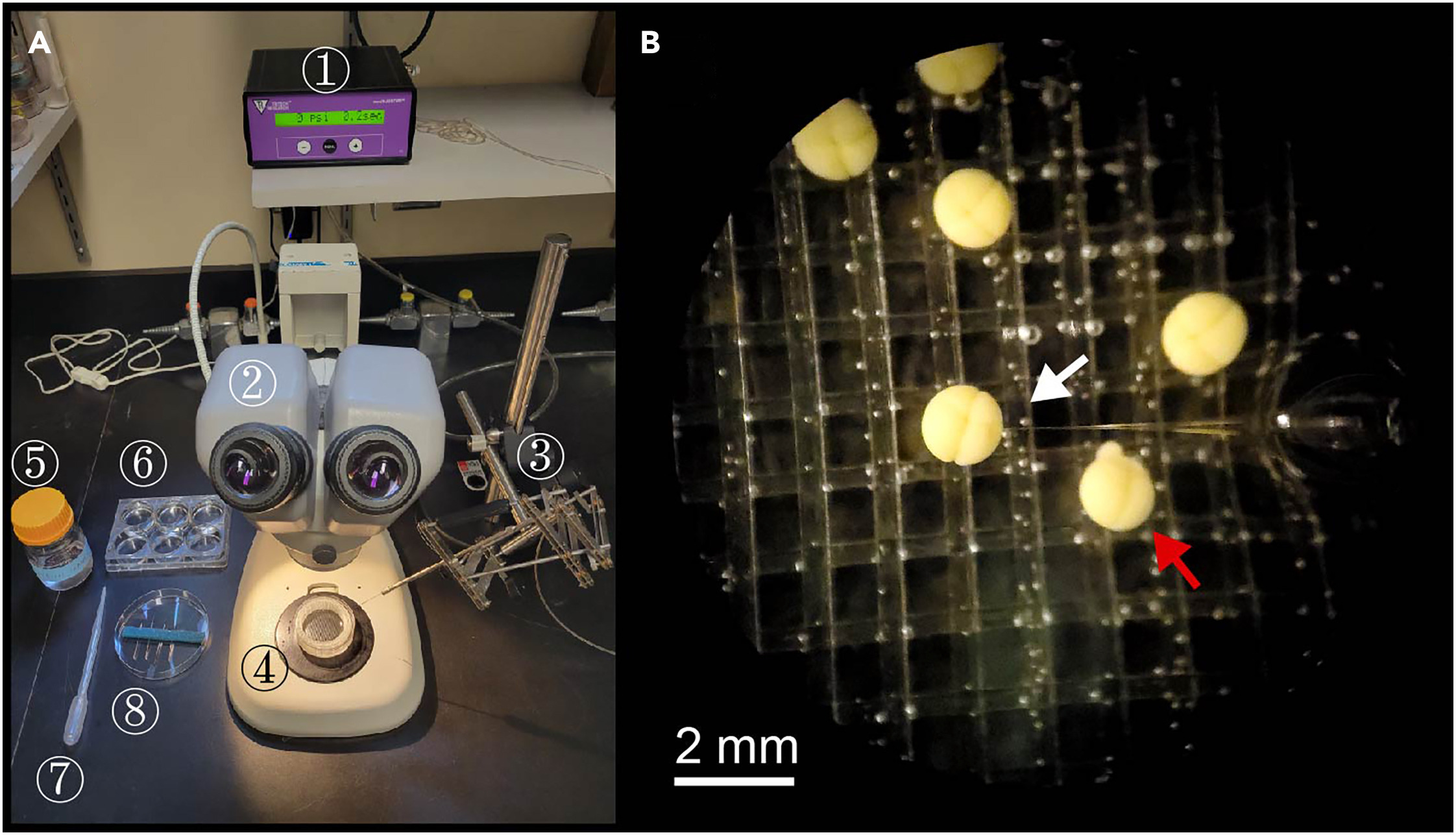 (A) Equipment setup for blastomere injection. ①Microinjector ②Dissecting scope ③Pantographic micromanipulator ④Injection chamber ⑤Blastomere injection medium (2% Ficoll in 1× MBSH) ⑥6-well plate to store injected embryos ⑦Transfer pipette to move embryos ⑧Calibrated injection pipettes.