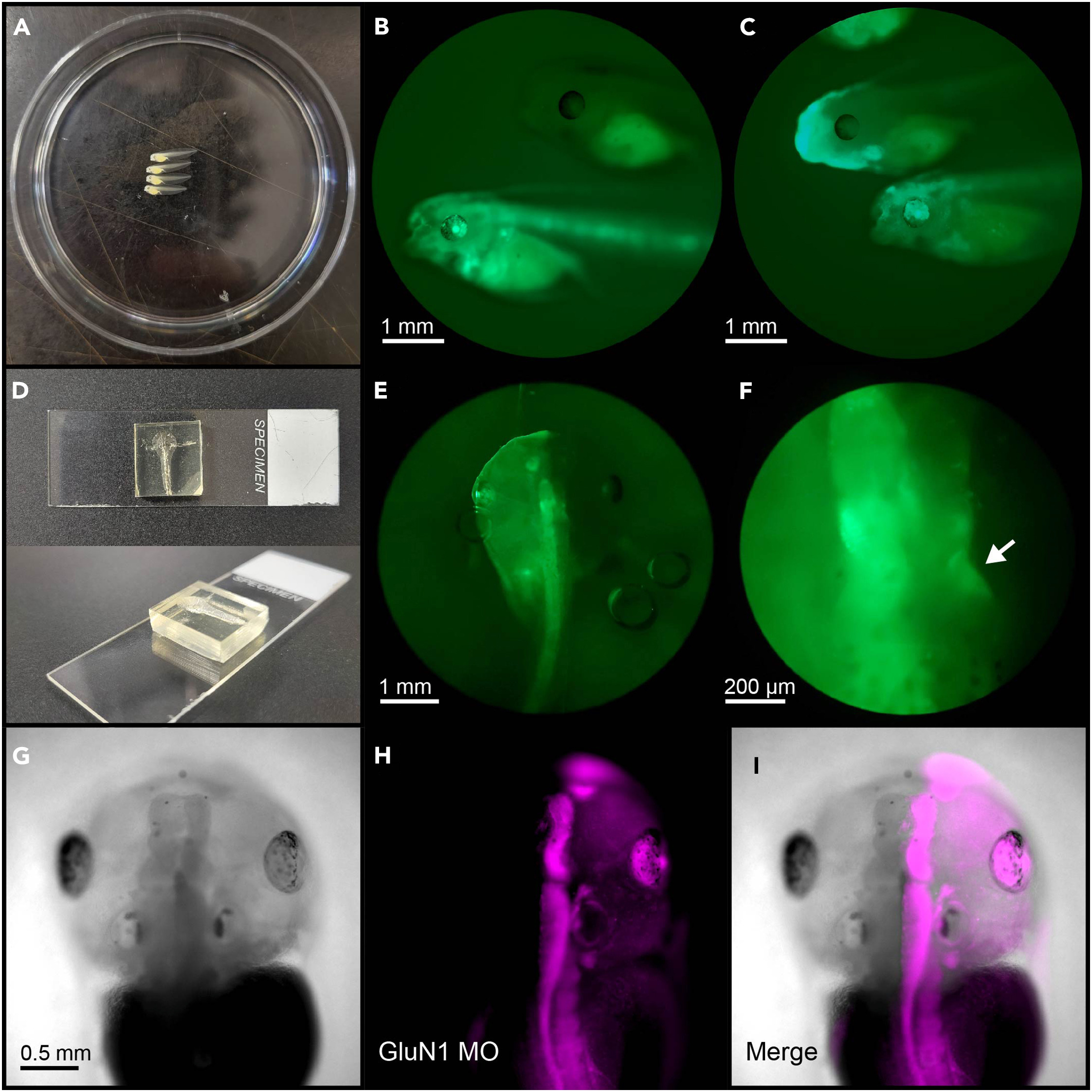 (G–I) Widefield images of a stage 45 GluN1 MO tadpole, adapted from Kesner et al.1 (G) Brightfield, (H) MO-lissamine fluorescence, (I) merged image. |