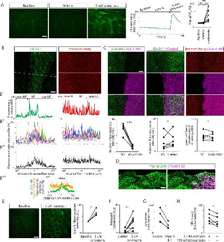 Glutamate is released from neural plate stage embryos in a VGluT1- and Ca2+-dependent manner. A–E, Two-cell stage embryos were bilaterally microinjected with mRNA encoding iGluSnFR (A–E) or membrane (memb)-mCherry (B, C) and unilaterally injected with VGluT1-morpholino 1 [VGluT1-knockdown (KD), C, D] or control-morpholino (Control, C). Embryos were live imaged (A–C, E) or processed for immunostaining (D). A, iGluSnFR expressed in neural plate stage embryos senses extracellular glutamate levels. Shown are single time frames of time-lapse recording of the neural plate in whole embryo when either vehicle or 5 mM glutamate was added to the bathing solution. Trace shows representative change in iGluSnFR fluorescence intensity over time. Graph shows individual maximal change in iGluSnFR fluorescence intensity after addition of vehicle or 5 mM glutamate. N = 7, **p < 0.01, ns, not significant, paired ANOVA. B, Released glutamate is higher in the neural plate. Shown is maximum intensity projection of confocal image of iGluSnFR- or memb-mCherry-expressing embryos and mediolateral fluorescence intensity profile for both reporters. While iGluSnFR exhibits higher intensity in membrane of neural plate cells located within 200 μm of the midline compared with non-neural ectodermal cells, memb-mCherry does not show a differential mediolateral distribution. Graphs show example (B’), all individual experiments (B”, B’’’’) and mean + SD (B’’’) mediolateral iGluSnFR and mem-mCherry fluorescence intensity (B’) and percent intensity profile (B’’–B’’’’), N = 5 iGluSnFR- and N = 4 mem-mCherry-expressing embryos. Comparison of best fit curves for iGluSnFR and mem-mCherry shows significantly different fluorescence intensity profiles [B’’’’, ****p < 0.0001, nonlinear regression fit, Lorentzian (Cauchy)]. C, VGluT1-KD impairs glutamate release. Images are representative examples of maximum intensity projection of unilaterally manipulated embryos as indicated. Graphs represent iGluSnFR (left and middle) or memb-mCherry (right) fluorescence intensity of individual embryos in WT and manipulated halves of neural plate. ***p < 0.001, ns, not significant, N = 5 (VGluT1-KD iGluSnFR and memb-mCherry), N = 6 (Control), 2-tail paired t test. D, Expression of iGluSnFR is not affected by VGluT1-KD. Shown is a representative example of 10 μm section of unilaterally VGluT1-KD neural plate immunostained for myc-tag linked to iGluSnFR construct, N = 3. E, Ca2+ entry in neural plate cells increases glutamate release. Images show iGluSnFR-expressing neural plate before and after addition of 5 μM ionomycin. Graph shows individual data of % maximal change in iGluSnFR fluorescence intensity after addition of ionomycin. N = 4, *p < 0.05, one-sample t and Wilcoxon test, compared with the hypothetical value of 100 (before addition of ionomycin). F–H, Neural plate stage wild type (F, H) and bilaterally morpholino-injected embryos (G, Control and VGluT1-KD) were incubated with 2 μM ionomycin (F–H) or vehicle (Control, F) in the presence (H) or absence (F–H) of 100 nM tetanus toxin for 20 min. Bathing solution was collected and released glutamate measured with a Fluorometric Glutamate Assay Kit. F, Graph shows released glutamate concentration in Control (vehicle) and ionomycin treated embryos, N = 9, **p < 0.01, 2-tail paired t test. G, Graph shows individual % change in released glutamate concentration in Control and VGluT1-KD embryos treated with ionomycin and compared with vehicle-treated (100%), N = 4, *p < 0.05, 2-tail paired t test. H, Graph shows individual % change in released glutamate concentration in embryos treated with ionomycin in the absence or presence of 100 nM tetanus toxin compared with untreated (100%), N = 6, *p < 0.05, 2-tail paired t test. |
