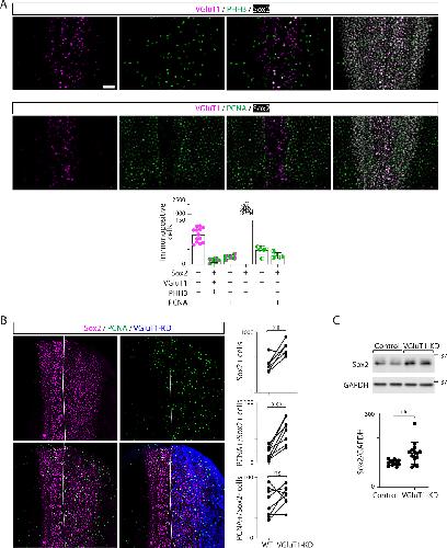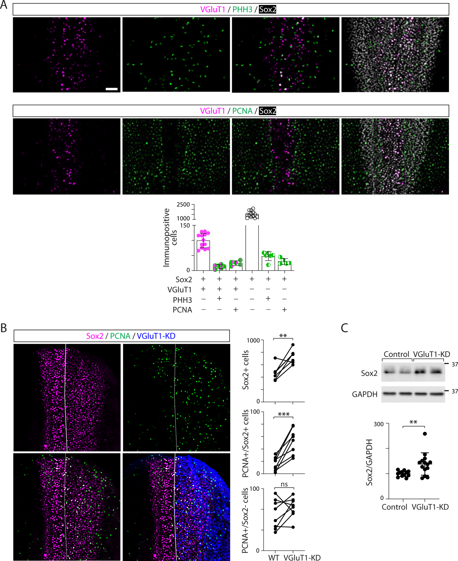 VGluT1 regulates neural plate cell proliferation and Sox2 expression. A, Wild-type neural plate stage (st. 18) embryos were processed for whole-mount immunostaining for VGluT1, Sox2, and cell proliferation markers PCNA and PHH3. Shown are representative images. Graph shows individual and mean ± SD number of total and proliferation marker immunopositive VGluT1+ and VGluT1− neural plate cells (Sox2+). B, Two-cell stage embryos were unilaterally injected with VGluT1-KD along with tracer. Neural plate stage (st. 18) embryos were processed for immunostaining. Images show representative example. Graphs show individual number of immunopositive (+) or immunonegative (−) cells in both halves of the neural plate per embryo. N = 7 embryos, **p < 0.01, ***p < 0.001, ns, not significant, 2-tail paired t test. C, Two-cell stage embryos were bilaterally injected with VGluT1-KD or Control. Neural plate stage embryos were processed for Western blot assays for Sox2 and GAPDH, as loading control. Image is a representative example. Graph shows individual samples and mean ± SD normalized Sox2 levels. N = 5 experiments, **p < 0.01, 2-tail t test. |