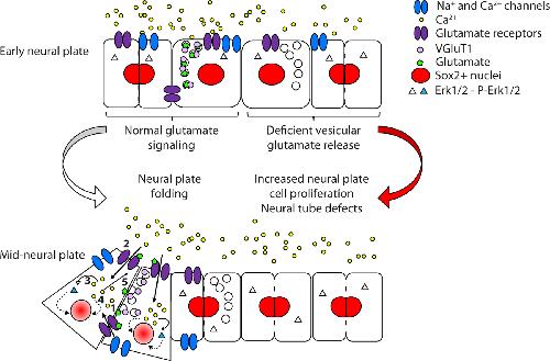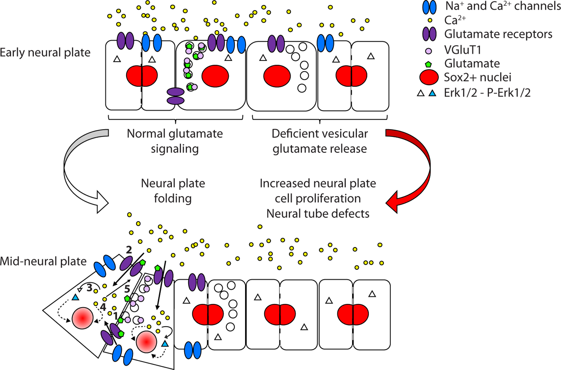 Model of mechanism of VGluT1-dependent regulation of neural tube formation. Vesicular release of glutamate (1) activates glutamate receptors eliciting Ca2+ transients in neural plate cells (2), which are necessary for the regulation of neural plate cell proliferation by downregulating Sox2 expression potentially (dashed arrows) through the recruitment of Erk1/2 (3) and/or other signaling pathways (4). Ca2+ transients are also necessary for the changes in cell shape (5) required for the timely folding of the neural plate during neural tube morphogenesis. |