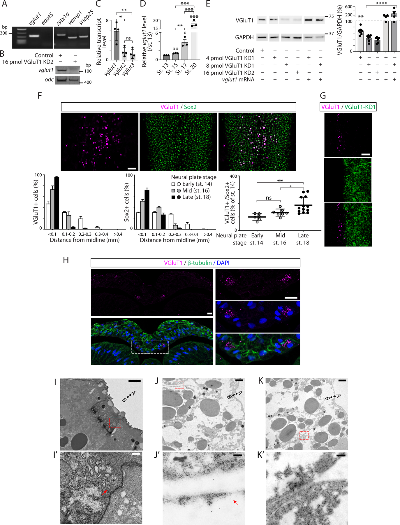 VGluT1 is expressed in the neural plate of X. laevis embryos. A–D, RNA was isolated from embryos at mid-neural plate stages and reverse transcriptase (RT)-PCR assays were performed for vglut1, eeat5, syntaxin1a (stx1a), vamp1, and snap25. B, Embryos were injected with a splicing-blocking morpholino targeting vglut1 (VGluT1-KD2) or control morpholino (Control). RT-PCR was performed with primers flanking a sequence between exon 1 and 2 that can only be detected in correctly spliced transcript (control). Shown is representative example of RT-PCR product in control and VGluT1-KD2 samples, N = 3. C, D, Quantitative RT-PCR was performed from samples of embryos at stage 20 to compare relative expression of vglut1, vglut2, and vglut3 (C) or with embryos at stages (st.) 13, 15, 17, and 20 to compare developmental regulation of vglut1 during neural plate folding (D). Graphs show individual and mean ± SEM transcript level as ratio of control transcript (sub-1, C) or as percent of vglut1 transcript level in the youngest stage tested (st. 13, D). N = 3 (C) and 4 (D) experiments, *p < 0.05, **p < 0.01, ***p < 0.001, one-way ANOVA (C and D), and one-sample t and Wilcoxon test [D, compared with hypothetical value of 1 (st. 13)]. E, Western blot assays were performed in whole-cell lysates from neural-plate stage control, VGluT1-knockdown (KD), and vglut1 mRNA-injected embryos. GAPDH was used as loading normalizer. Shown is a representative example. Graph shows normalized signal intensities from individual samples and means as percentages of control values (dashed line, 100%) from N ≥ 4 experiments. Statistical analysis was done with one-sample t and Wilcoxon test, **p < 0.01, ****p < 0.0001. F, Representative maximum intensity projection of whole-mount immunostained dorsal half of mid-neural plate stage (st. 16) embryo for VGluT1 and Sox2 (neural stem cell marker). Graphs show mediolateral (mean percent of VGluT1+ (left) and Sox2+ (middle) cells per 100 μm bin from the midline compared with the total number of VGluT1+ and Sox2+ cells, respectively ± SEM) or developmental (right; individual data and mean percent of VGluT1+ cells of the total number of Sox2+ cells ± SEM) distribution of number of VGluT1 immunopositive (+) cells. **p < 0.01, ns, not significant, one-way ANOVA. N = 3. G, VGluT1-KD decreases the number of VGluT1+ cells in the neural plate. Shown is a maximum intensity projection of whole-mount immunostained unilaterally VGluT1-KD neural plate from a representative embryo, N = 3. H, Representative maximum intensity projection of 10-μm-thick transverse section of neural plate stage (st. 16) embryo for VGluT1 and β-tubulin, nuclei labeled with DAPI. Scale bars, 20 μm. I–K, Neural plate stage (st. 18) embryos were processed for transmitted (I) and immuno-transmitted (J, K) electron microscopy assays. Shown are representative examples. A, apical; B, basal. Dashed boxes in I–K indicate fields of view shown in I’–K’. Arrow in I’ points to vesicular structures and in J’ to structure with lipidic-looking background (vesicular) close to the cell–cell border immunopositive for VGluT1. J, K, Ultrathin sections were incubated with J, J’ or without K, K’ 1:3,000 VGluT1 antibody, followed by the same immunogold labeling procedure as indicated in Materials and Methods. N = 3, scale bars, 2 (I–K) and 0.2 (I’–K’) μm. |