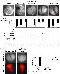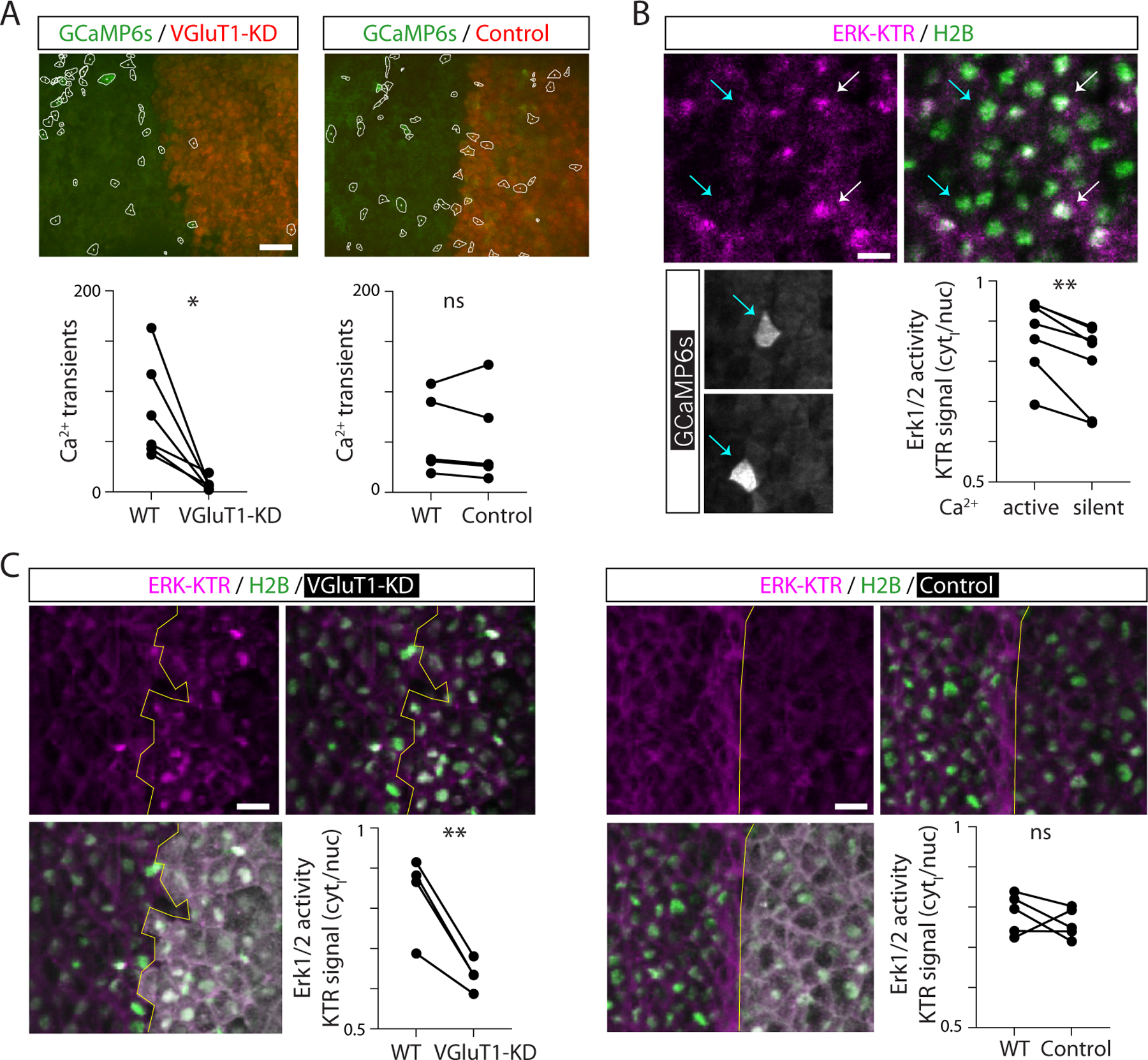 Ca2+ dynamics in the neural plate during folding depend on VGluT1 and activate Erk1/2. A, Two-cell stage embryos were unilaterally VGluT1 knocked down (KD) and bilaterally injected with mRNA encoding GCaMP6s, Ca2+ reporter. Neural plate stage embryos were time-lapse imaged for 5 min and number of Ca2+ transients were measured. Image shows representative example of unilateral (red) VGluT1-KD and Control embryos. Circled cells are those exhibiting Ca2+ transients during recording. Graphs show individual number of Ca2+ transients per 5 min in WT and VGluT1-KD or Control halves of the neural plate. N = 6 VGluT1-KD and 5 Control embryos, *p < 0.05, ns, not significant, 2-tail paired t test. B, Two-cell stage embryos were bilaterally injected with ERK-KTR-iRFP670 (Erk1/2 activity reporter), H2B-RFP (nuclear marker), and GCaMP6s. Neural-plate stage embryos were time-lapse imaged for 2 h, and cells exhibiting Ca2+ transients and those matching contralaterally their mediolateral and anteroposterior locations were selected for measurement of the ERK-KTR nuclear (delimited by H2B signal) and non-nuclear (cytosolic, delineated by GCaMP6 signal) fluorescence signal. ERK-KTR reports on active and inactive Erk1/2 with low and high nuclear versus cytosolic fluorescence intensity, respectively (Fig. S1). Top images are a representative example of single time frame of an embryo live imaged. Cyan arrows point to two cells exhibiting Ca2+ transients (active), and white arrows point to similarly positioned (mediolaterally and anteroposteriorly) cells that did not exhibit Ca2+ transients (silent) during recording. Bottom images show the two cells exhibiting Ca2+ transients during peak of transient. Graph shows mean ratio of ERK-KTR cytosolic/nuclear fluorescence intensity per embryo in active and silent cells. N = 7 embryos, n = 10 cells per embryo, **p < 0.01, 2-tail paired t test. C, Two-cell stage embryos were bilaterally injected with ERK-KTR-iRFP670 and H2B-RFP and unilaterally with VGluT1-KD or Control along with tracer. Neural plate stage embryos were time-lapse imaged and ERK-KTR nuclear (delimited by H2B signal) and cytosolic fluorescence signal was measured in WT and injected neural plate cells. Images show single time frame of unilateral VGluT1-KD and Control embryos. Yellow line separates WT from injected half neural plate. Graph shows mean ratio of ERK-KTR cytosolic/nuclear fluorescence intensity in each half of the neural plate per embryo. N = 4 embryos, n = 10 cells per embryo (VGluT1-KD) and N = 5 embryos, n = 10 cells per embryo (Control), **p < 0.01, ns, not significant, two-tail paired t test. Scale bars, 20 μm. |