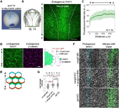 F, G, Co-localization of endogenous Wnt11 and pVangl2 at subcellular resolution in the neural plate. Wnt11 and pVangl2 are frequently co-localized in a punctum-by-punctum manner (arrowheads), but not with wheat germ agglutinin (membrane marker).