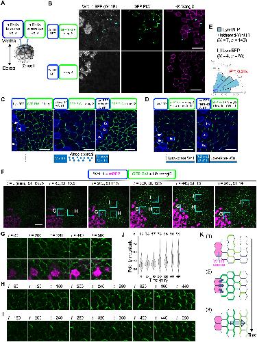 (A) Schematic illustration of mRNA injection for rPCP. Xenopus embryos injected with mRNAs at the 32-cell stage were observed at St. 14. (B) Localization of Wnt11 depends on rPCP. Arrowheads indicate accumulations of Wnt11-BFP with GFP-Pk3 in a region in which GFP-Pk3 and HA-Vangl2 are sparsely expressed. Ectopic HA-Vangl2 without GFP-Pk3 is not sufficient for localization of Wnt11-BFP. (C) Tethered-Wnt11 cannot polarize GFP-Pk3 at long range, but does in adjacent cells. Note the presence (closed arrowheads) and absence (open arrowheads) of GFP-Pk3 at boundaries facing tracer- and tethered-Wnt11–expressing cells, respectively. (D) Ubiquitously expressed Wnt11 can polarize GFP-Pk3 without direction, and when combined with direction by tethered-Wnt11, polarization can be aligned over long range. Note the presence (closed arrowheads) and absence (open arrowheads) of GFP-Pk3, respectively. (E) Quantification of polarity angles with or without direction by tethered-Wnt11. Numbers of embryos (N) and numbers of cells (n) are as indicated. (F to I) Time-lapse imaging of rPCP formation in the animal cap region. mRFP1 was used as a tracer for Wnt11-expressing cells. (F) Overall, polarization appears to propagate from the vicinity of the Wnt11 source to distant regions. [(G) to (I)] Subregions adjacent [(G) and (H)] or distant (I) to the source are enlarged. (J) Quantification of polarity magnitude of GFP-Pk3 in the time-lapse imaging. Numbers of analyzed cells (n) are as indicated. (K) Schematic illustrations of PCP formation in rPCP. mRNAs were injected into ventral animal blastomeres at the 32-cell stage, as illustrated. Amounts of mRNAs (in picograms per embryo): wnt11-BFP, 500; lyn-BFP, 50; GFP-pk3, 200 [(B) to (E)] and 100 [(F) to (J)]; HA-vangl2, 100 [(B) to (E)] and 50 [(F) to (J)]; wnt11, 500 [(C) and (F) to (J)] and 50 (D); tethered-wnt11, 500; and mRFP1, 500. Scale bars, 50 μm. Representative data from two [(B) to (E)] or three [(F) to (J)] independent experiments are presented. Xenopus illustrations © Natalya Zahn (2022) (CC BY-NC, https://creativecommons.org/licenses/by-nc/4.0/deed.en). |