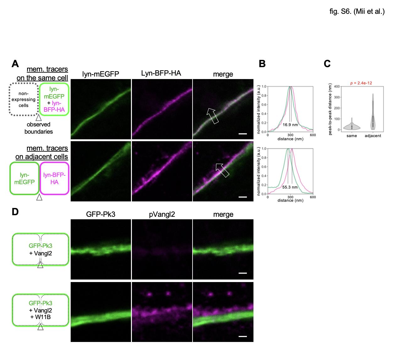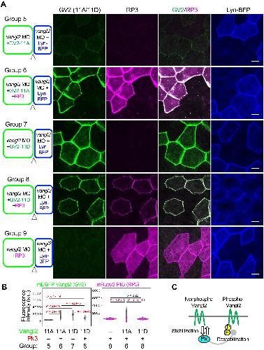 Amounts of mRNAs (ng/embryo): lyn-mEGFP, 0.10; lyn-BFP-3HA, 0.10; GFP-pk3, 0.20; vangl2, 0.10; wnt11-BFP, 1.0. Scale bars, 500 nm. |