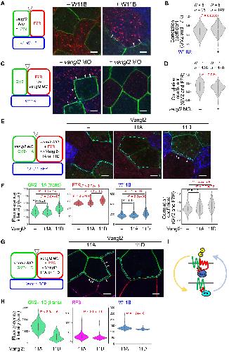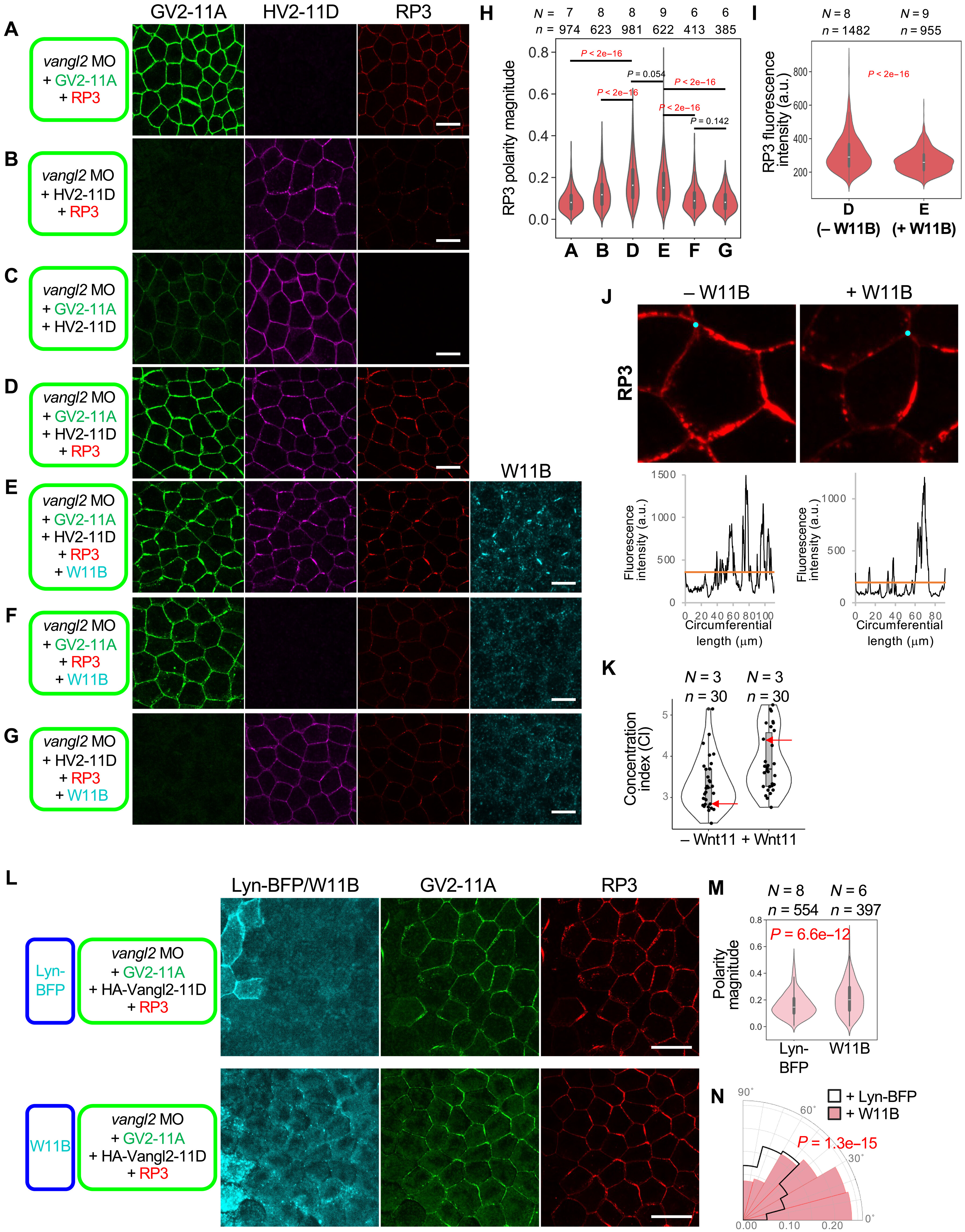 Amounts of mRNAs: vangl2, 100; GFP-pk3, 200; mEGFP-krasCT, 50; wnt11, 250; wnt11-BFP , 1.0 ng/embryo. Scale bars, 50 µm (A),100 µm (D) 10 µm (I). Numbers of embryos (N) and numbers of cells (n) are as indicated. Representative data from two independent experiments are presented. |