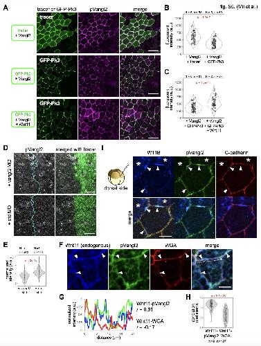 (B, C) Quantification of staining intensity of pVangl2. A single data point corresponds to an average intensity of a line plot on a cell boundary between tracer/GFP-Pk3-positive and -negative cells. Numbers of embryos (N) and numbers of cell boundaries (n) are as indicated. For (+ Vangl2, + GFP-Pk3), the same data are presented in B and C.