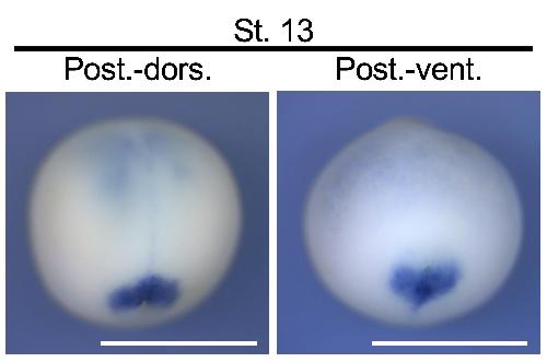 wnt11b (wingless-type MMTV integration site family, member 11B) gene expression in Xenopus laevis embryo via in situ hybridization, NF stage 13, posterior-dorsal and posterior-ventral views.