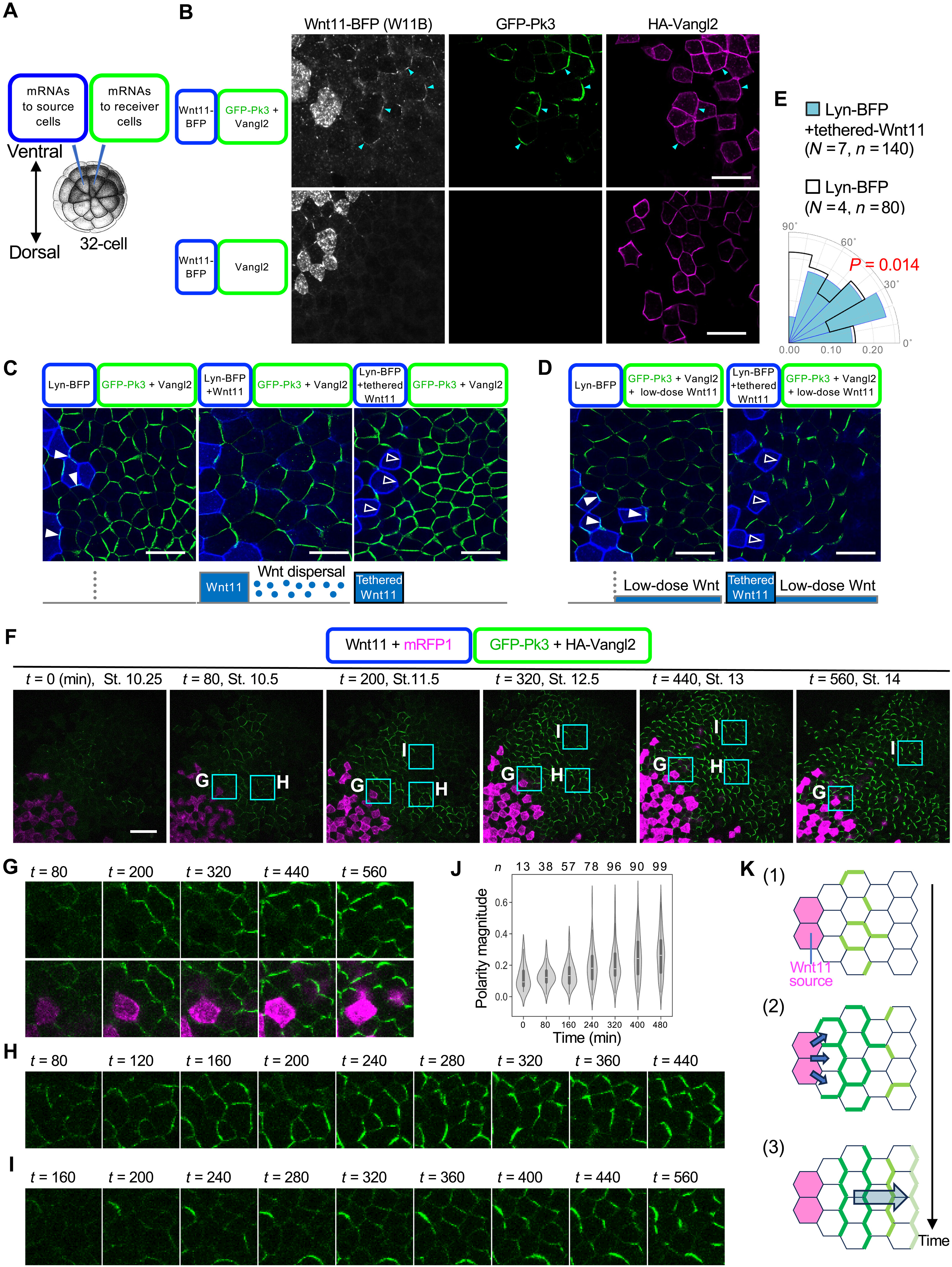 Fig. 2. Spatial bias–driven and bias-free roles of Wnt11 for PCP and spatiotemporal profiling of Wnt-dependent polarization of GFP-Pk3.