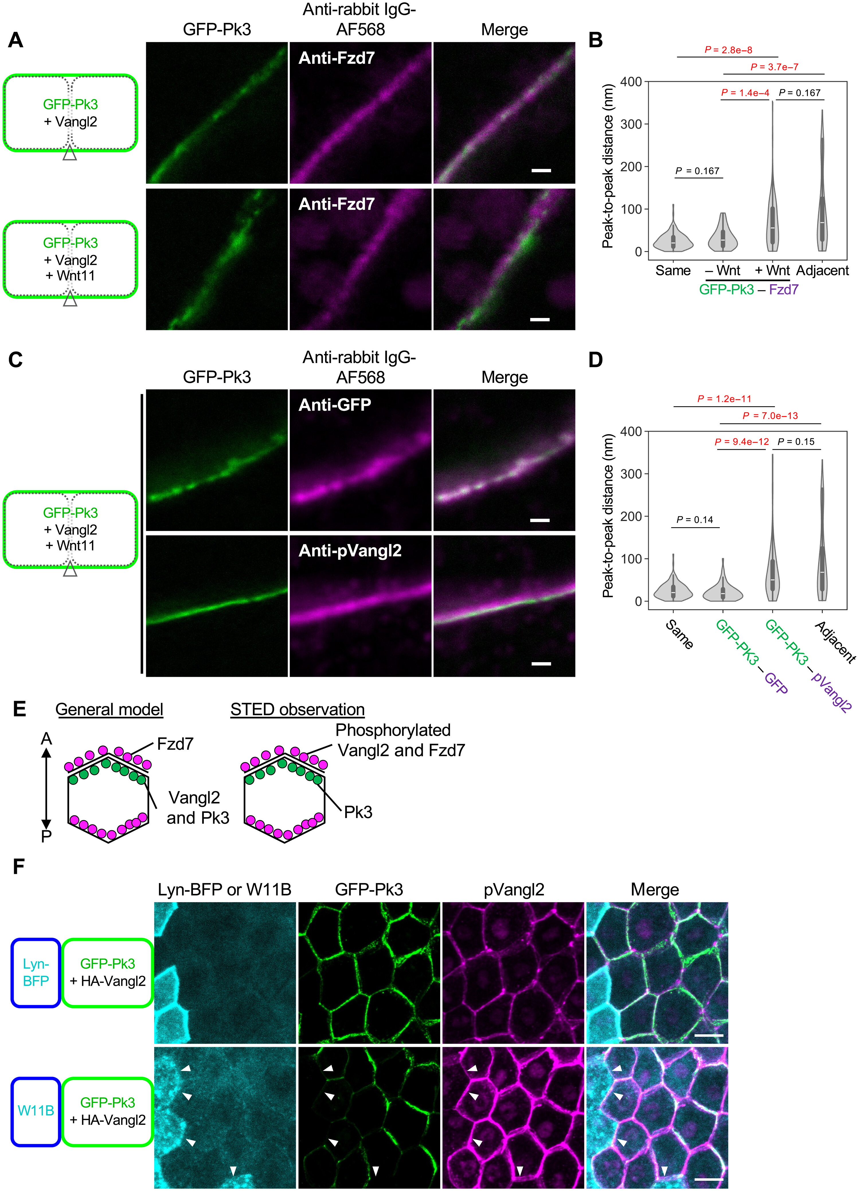 (A) GFP-Pk3 and endogenous Fzd7 in the absence or presence of Wnt11 (not polarized or polarized, respectively) were observed by STED microscopy. (B) Peak-to-peak distance (PPD) between Fzd7 and GFP-Pk3 shown in (A). For comparison, PPDs between membrane traces on the same cells and on adjacent cells are shown as “same” and “adjacent,” respectively (see fig. S6C). Data from three embryos, 15 cell boundaries, 67 lines (–Wnt) and four embryos, 18 cell boundaries, 76 lines (+Wnt) are presented. (C) STED observations of GFP-Pk3 and phosphorylated Vangl2 in cells polarized by overexpression of Wnt11. GFP-Pk3 and immunostaining with anti-GFP or anti-pVangl2. Anti-GFP staining was used as a control that overlapped with GFP fluorescence. (D) PPDs between GFP-Pk3 and anti-pVangl2 staining shown in (C). Data from three embryos, 14 cell boundaries, 74 lines (anti-GFP) and three embryos, 16 cell boundaries, 90 lines (anti-pVangl2) are presented. (E) Localization of core PCP components based on STED microscopy. Our STED analyses suggest that phosphorylated Vangl2 localizes on the opposite side from Pk3, possibly the same side as Fzd7. Because Pk3 preferentially binds to nonphosphorylated Vangl2 (50), we speculate that nonphosphorylated Vangl2 is on the same side as Pk3. (F) pVangl2 localized to cell membranes where GFP-Pk3 was reduced by Wnt11 in rPCP. Components indicated at the left side were expressed as shown in Fig. 3A. All STED pictures in Fig. 5 and fig. S6 are shown under the same condition for brightness/contrast. mRNAs were injected into animal pole regions of ventral blastomeres at the four-cell stage, as indicated. Amounts of mRNAs (in nanograms per embryo): GFP-pk3, 0.20; vangl2, 0.10; HA-vangl2, 0.10; wnt11, 0.25; wnt11-BFP, 0.50; and lyn-BFP, 0.050. Scale bars, 500 nm [(A) and (C)] and 20 μm (F). Representative data from two independent experiments are presented. |