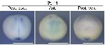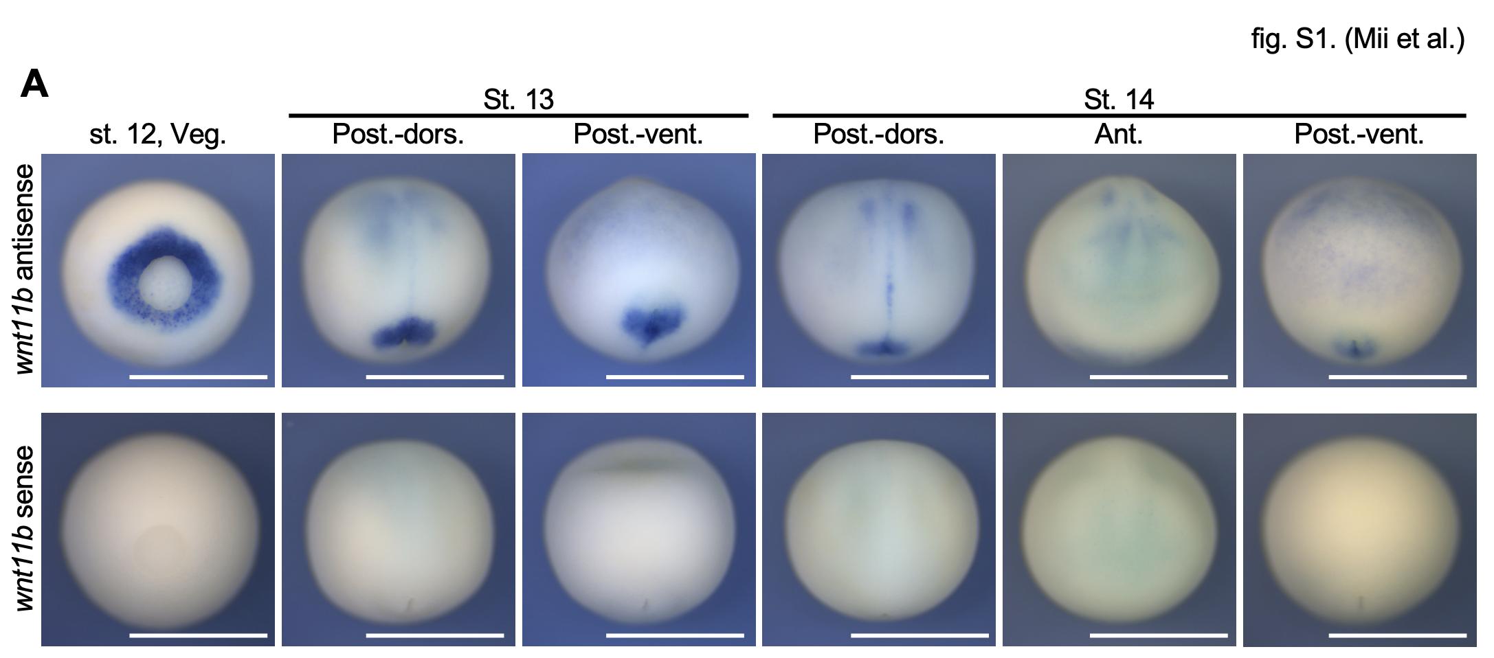 wnt11b (wingless-type MMTV integration site family, member 11B) gene expression in Xenopus laevis embryo via in situ hybridization, NF stage 14, posterior-dorsal, anterior and posterior-ventral views.