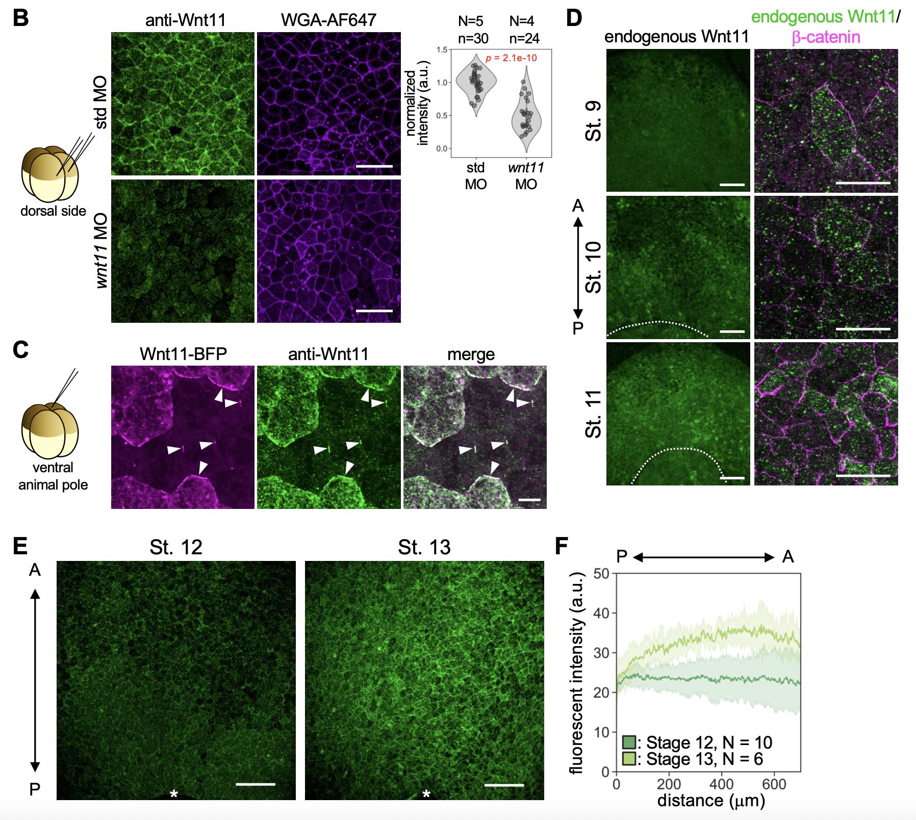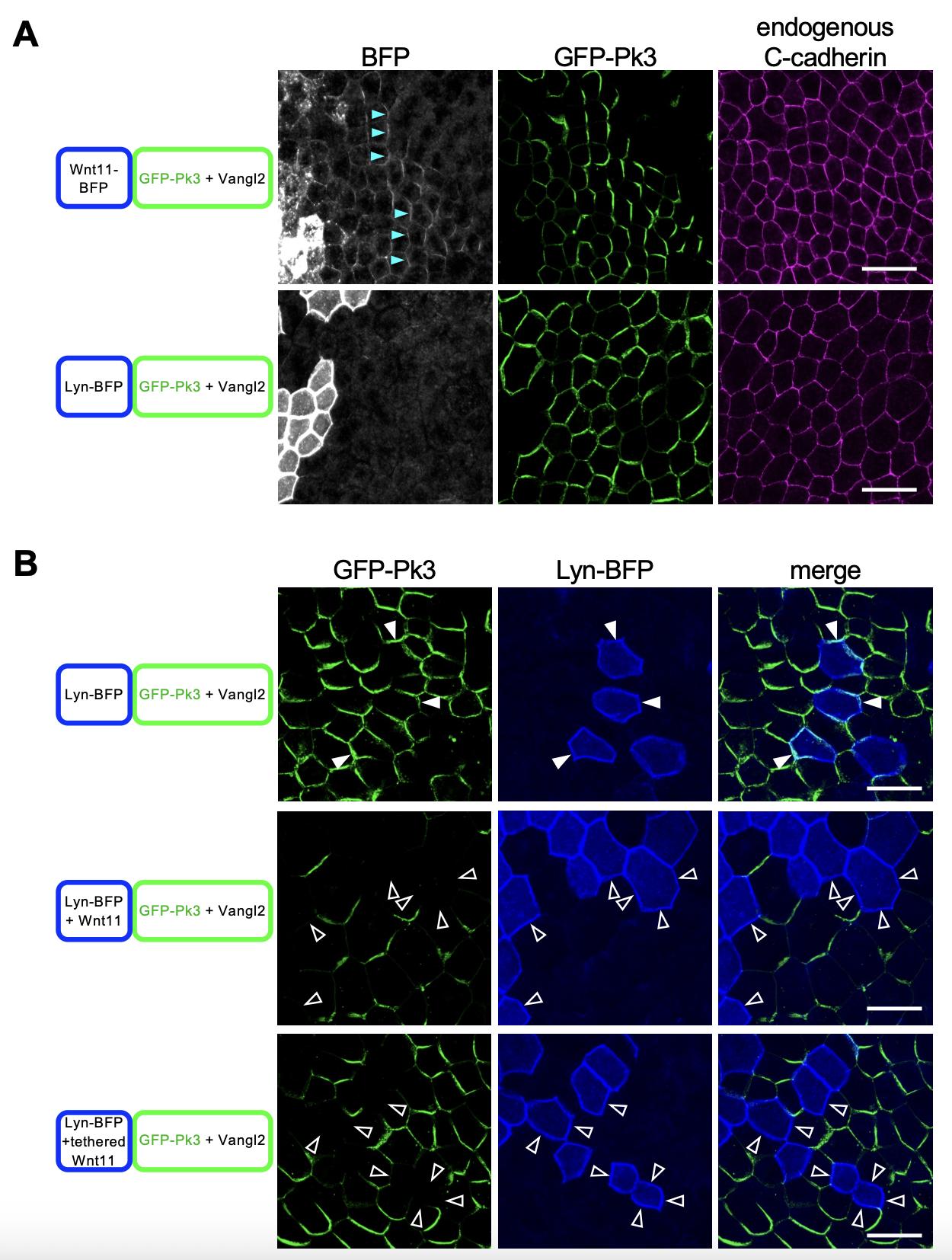 C, anti-Wnt11 staining with overexpression of mTagBFP2-tagged Wnt11 (Wnt11-BFP, W11B). Anti-Wnt11 staining overlapped with localization of Wnt11-BFP , including accumulation and puncta at cell boundaries (arrowheads). wnt11-BFP mRNA (1.0 ng/embryo) was injected as illustrated.