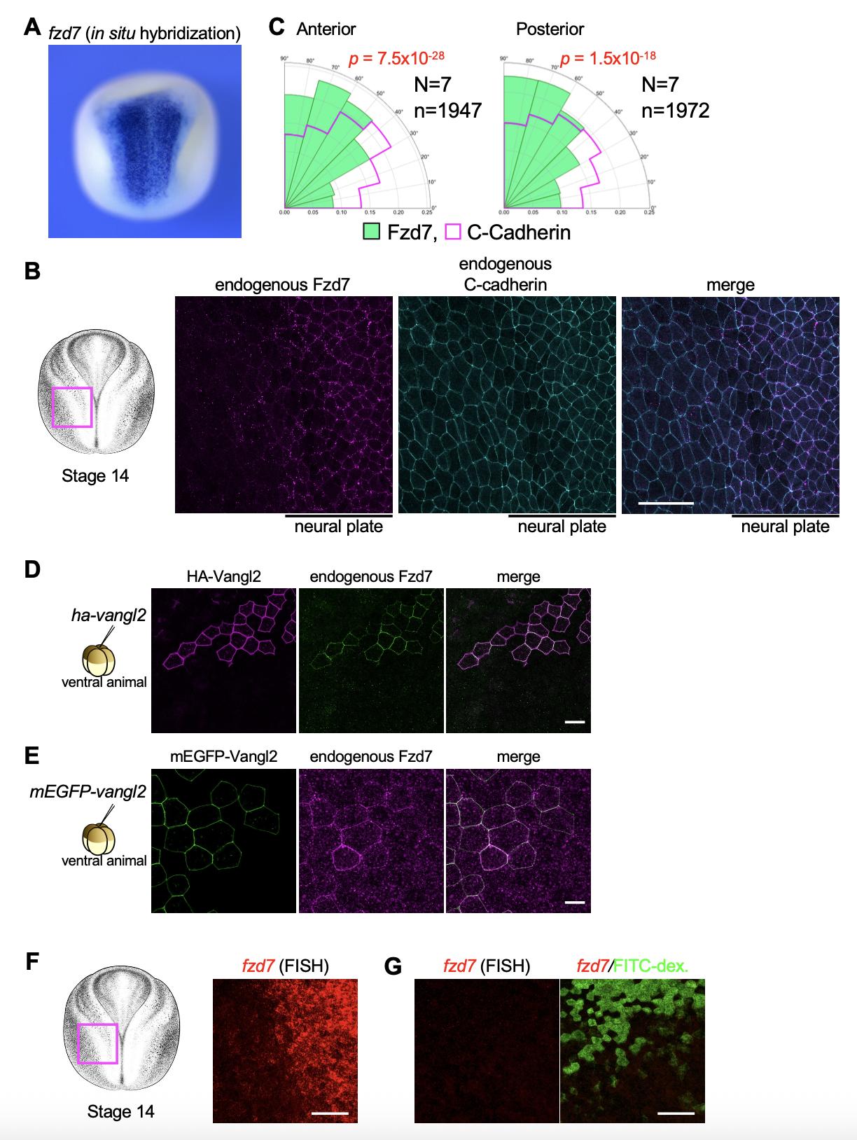 B, Membrane localization of endogenous Fzd7 was specifically observed in the neural plate. A boundary region of the neural plate was observed as illustrated. C-cadherin was stained as a membrane