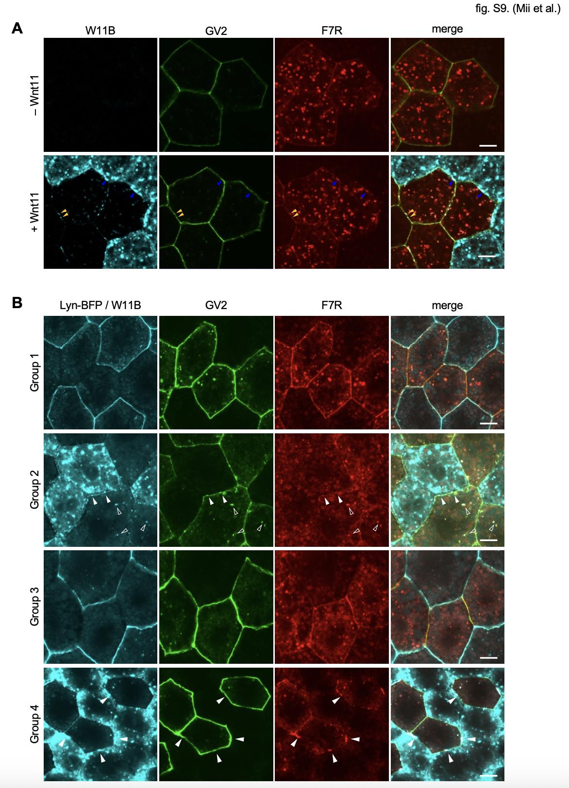 H, GFP-Pk3 is endocytosed with F7R and W11B. Because W11B is expressed in adjacent cells, W11B-positive puncta inside GFP-Pk3-, HA-Vangl2- and F7R-expressing cells must be internalized by