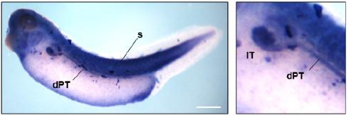 idh2 () gene expression in Xenopus laevis embryo, assayed via in situ hybridization, NF stage [STAGE], lateral view, anterior left, dorsal up.