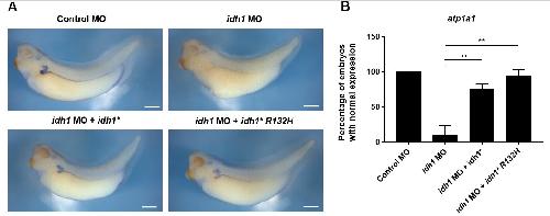 Fig. 3. Wild-type and R132H mutant idh1 restore pronephric marker expression in idh1-depleted Xenopus embryos. (A) WISH for atp1a1 showing pronephric structures in control embryos, idh1 morphants, and idh1 morphants co-injected with either wild-type (WT) idh1* mRNA or idh1*R132H mRNA. (B) Quantification of embryos exhibiting normal atp1a1 expression, based on intact staining intensity and normal pronephric morphology, as shown in (A). Both WT and R132H mRNA restored pronephric marker expression in idh1-depleted embryos (**p<0.01; one-way ANOVA followed by Dunnett’s multiple comparisons test). Scale bars: 500 μm. MO, morpholino oligonucleotide; WISH, whole-mount in situ hybridization; ANOVA, one-way analysis of variance.