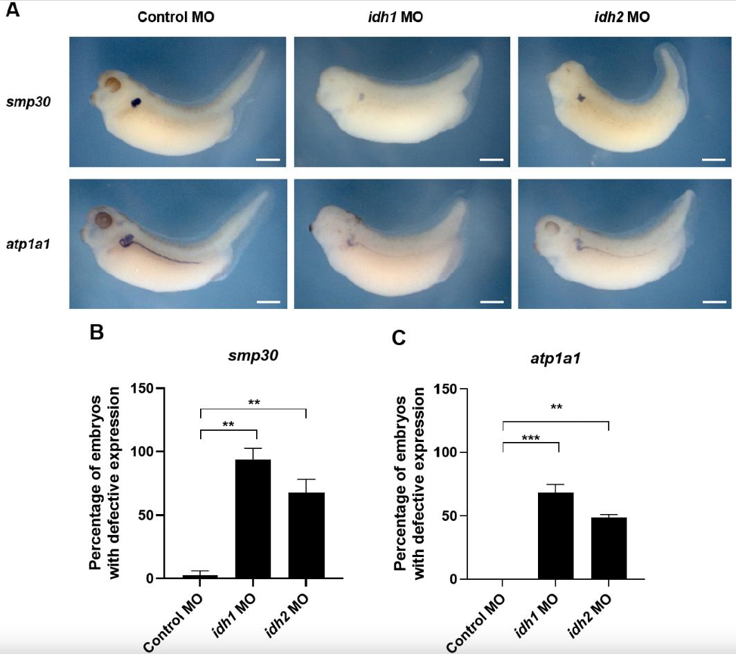 Fig. 2. Knockdown of idh1 and idh2 disrupts pronephric development in Xenopus laevis. (A) WISH showing reduced smp30 and atp1a1 expression in idh1 and idh2 morphants, with a more pronounced reduction observed in idh1 morphants. (B,C) Quantification of embryos classified as defective based on reduced staining intensity and/or abnormal spatial patterning of smp30 (B) and atp1a1 (C) expression, as represented in (A). **p<0.01, ***p<0.001; one-way ANOVA followed by Dunnett’s multiple comparisons test. Scale bars: 500 μm. MO, morpholino oligonucleotide; WISH, whole-mount in situ hybridization; ANOVA, one-way analysis of variance.