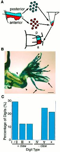 Figure 4. Recombinants with anterior and posterior cell reaggregates. A: The scheme represents recombination of anterior cell and posterior cell reaggregates. B: Digit pattern in a recombinant with anterior and posterior cell reaggregates. Arrows indicate digits 3. Arrowheads show the hostâgraft boundary. C: Histogram showing the percentage distribution of digit types in recombinants with anterior and posterior cell reaggregates. Roman numerals indicate digit types. x, unidentifiable digit. Scale bar = 1 mm in B.