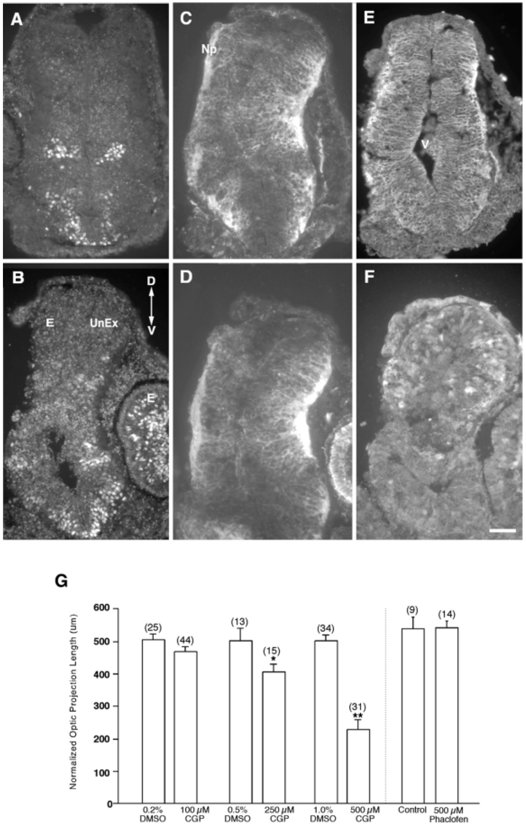 is unaffected by treatment with 500 M CGP54626. Bar in F is 100 m. (G) Mean normalized optic tract
