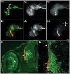 (green) and the HRP-labeled optic projection (red) at stages 35/36 (A) and 37/38 (B). (A1–B1).