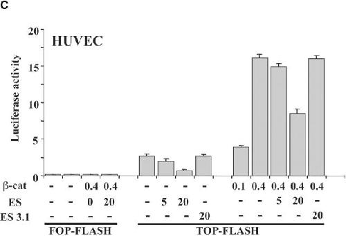Figure 2. ES inhibits β-cateninâdependent signaling. (A) Embryos were injected into one ventral vegetal blastomere with 50 pg of β-catenin (β-cat) RNA with or without 2 ng of ES or ES-m RNA. Secondary axis induction was assessed after 48 h culture at room temperature. (B) Luciferase activity was measured in embryos microinjected with the Siamois promoterâreporter construct (pSiaLuc). pSia-Luc activation by β-catenin was reduced by ES but not by ES-m. (C) The effect of ES on β-catenin signaling in endothelial cells. Transcriptional activation of the TOP-FLASH and FOP-FLASH reporters was measured in HUVECs transfected with indicated plasmids in the presence or absence ES or ES mutant (ES 3.1). Numbers show the amount of ES in μg/ml and the amount of transfected β-catenin plasmid per well of a 6-well plate. Cells were transfected with 0.8 μg of each reporter plasmid. |