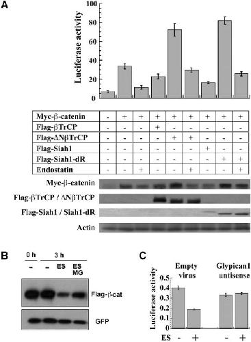 Figure 5. ES effects on β-catenin are not mediated through βTrCP or Siah1. (A) CPAE cells were transfected with 0.4 μg of mycâβ-catenin and 0.8 μg of each Flag-βTrCP, Flag-ÎNβTrCP, Flag-Siah1, or FlagâSiah1-dR, as indicated, in the presence (20 μg/ml) or absence of ES. ES reduced transcriptional activation of TOP-FLASH by β-catenin in the presence of dominant negative forms of βTrCP or Siah1. β-catenin levels were measured in the same experiment in the presence (20 μg/ml) or absence of ES. (B) Proteasome inhibitor treatment reverses the effect of ES on β-catenin. CPAE cells were transfected with the Flagâβ-catenin and GFP plasmids. After 24 h, cells were incubated with ES (10 μg/ml) and/or the proteasome inhibitor MG132 (MG) for 3 h as indicated. Cell lysates were collected for Western blotting with anti-Flag and anti-GFP antibodies. (C) ES effect on TOP-FLASH requires glypican 1. Transcriptional activity of TOP-FLASH was measured in glypican 1 antisense virus- or control vector-infected HUVEC. |