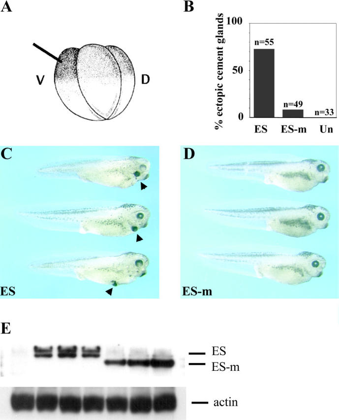 Figure 1. Developmental effects of ES in Xenopus embryos. Four to eight cell embryos were injected into the animal side of one ventral (V) blastomere (A) with wild-type or mutated ES RNAs (2 ng each) and cultured for 48 h at room temperature to assess cement gland development. (B) Summary of the data. (C) Embryos injected with ES RNA develop ectopic cement glands (arrowheads). (D) Embryos injected with RNA encoding an NH2-terminal deletion construct (ES-m) are indistinguishable from uninjected embryos. (E) Protein expression levels in embryos injected with ES and ES-m RNAs assessed by anti-ES antibody. |