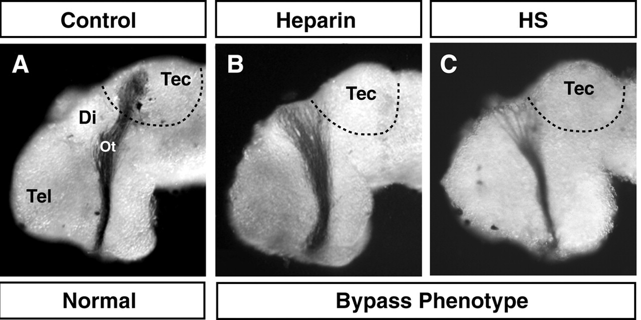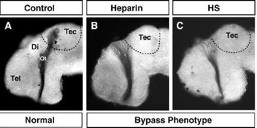 Fig. 1. Disruption of retinal axon targeting with exogenously applied GAGs. Lateral view of whole-mount brains at stage 40 showing the trajectories of HRP-filled optic projections. One side of the brain was exposed to GAGs from stage 35/36 to 40, the time when axons first grow from the mid-optic tract into the optic tectum (Tec). (A) Control projection showing HRP-filled axons coursing through the optic tract (Ot) in the diencephalon (Di) and crossing the diencephalon/midbrain boundary (dashed line anteriorly) into the tectum. Note the caudalward bend in the projection in the mid-optic tract. (B,C) Projections exposed to GAGs exhibiting the bypass phenotype. Brains were treated with 100 μg/ml of bovine lung heparin (B) and porcine mucosal HS (C), beginning when axons were in the mid-optic tract. The axons extend normally to the mid-optic tract, then take an aberrant route dorsally in the diencephalon, failing to cross the diencephalon/midbrain boundary, and bypass the tectum. Note the absence of a caudalward bend in the mid-optic tract. Tel, telencephalon; dorsal is up, anterior to the left.
