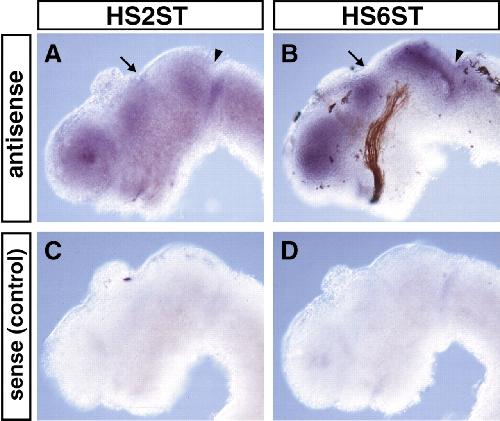 Fig. 7. Expression pattern of Xenopus HS2ST and HS6ST in the embryonic brain. (A,B) Lateral views of brains (stage 39) after whole-mount in situ hybridisation with antisense HS2ST (A) and HS6ST (B) RNA probes. Retinal axons are stained with HRP in (B). Arrows and arrowheads indicate the borders of the diencephalon/tectum and tectum/hindbrain, respectively. (C,D) Control embryos hybridised with sense probes.