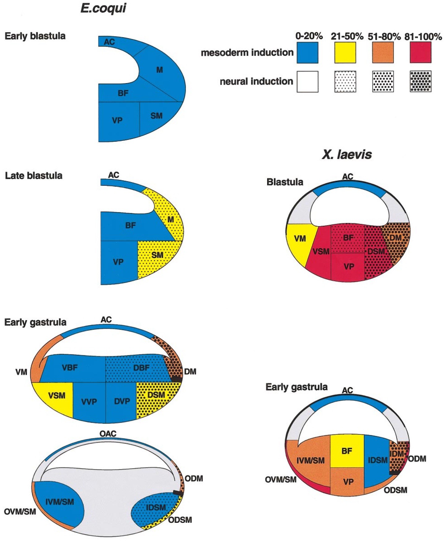 The direct developing frog, Eleutherodactylus coqui, develops from a large egg (diameter 3.5 mm). To investigate the effect of egg size on germ-layer formation, we studied mesoderm formation in E. coqui and compared it to that of Xenopus laevis (diameter 1.3 mm). First, we identified the position of prospective mesoderm in the 16-cell E. coqui embryo by cell-lineage tracing. Although the animal blastomeres are small, they form most of the blastocoel roof and make extensive contributions to some mesodermal tissues. Second, we performed recombinant analysis with X. laevis animal caps to define the distribution of mesoderm-inducing activity. Mesoderm-inducing activity in E. coqui was restricted around the marginal zone with strong activity in the superficial cells. Neither the vegetal pole nor the blastocoel floor had activity, although these same regions from X. laevis induced mesoderm. Third, we cloned Ecbra, a homologue of Xbra, an early mesoderm marker in X. laevis. Ecbra was expressed in the marginal ring close to the surface, similar to X. laevis, but E. coqui had weaker expression on the dorsal side. Our results suggest that mesoderm formation is shifted more animally and superficially in E. coqui compared to X. laevis.