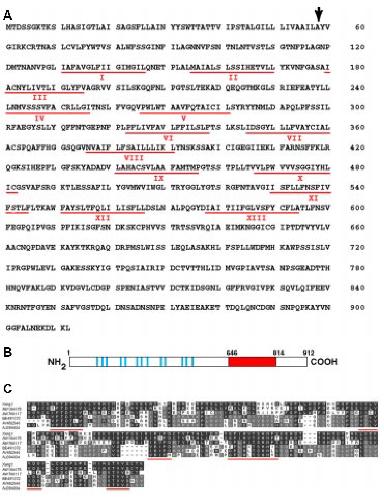 signal peptide cleavage site and underlined in red are the numbered hydrophobic segments. (B)