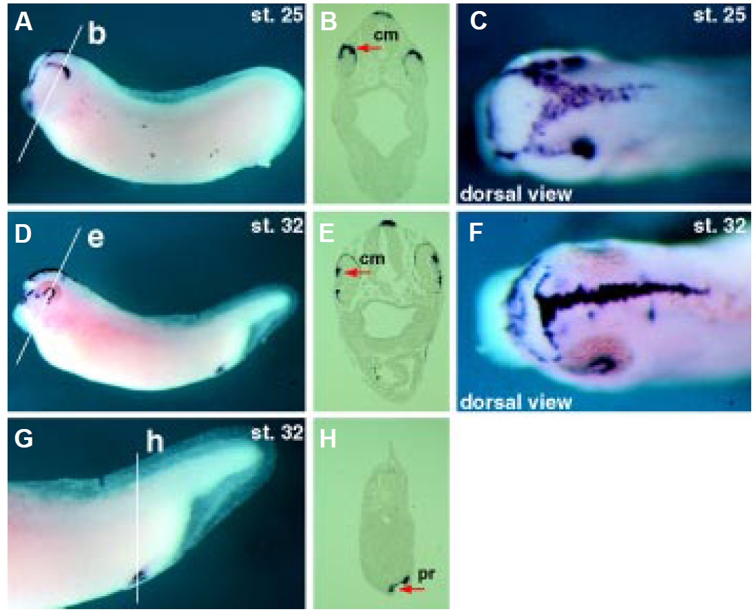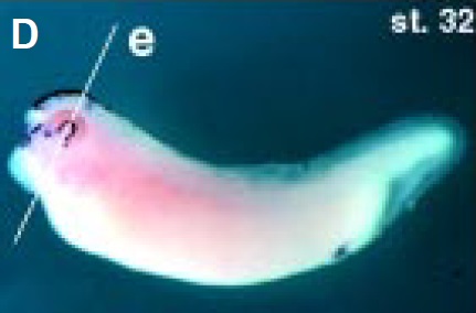 loc398207 (putative transmembrane protein TA-2) gene expression in a Xenopus laevis embryo, NF stage 32, as assayed by in situ hybridization. lateral view, dorsal up, anteriorleft.