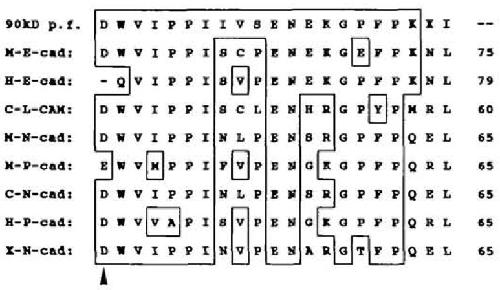 Description 90kDa trypsin fragment from membrane fraction of Xenopus A6 cells. Part of the immunogen was sequenced as DWVIPPIIVSENEKGPFPKxI, corresponding to CDH1, where the analogous sequence in Cdh3 is DWVIPPIKVSENERGPFPKRL