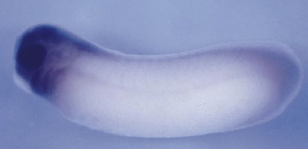 Larger Image ran (RAN, member RAS oncogene family ) gene expression in Xenopus laevis embryo, assayed via in situ hybridization, NF stage 27, lateral view, anterior left, dorsal up. Image published in: Wischnewski J et al. (2000) Copyright © 2000. Image reproduced with permission of the Publisher, Elsevier B. V.