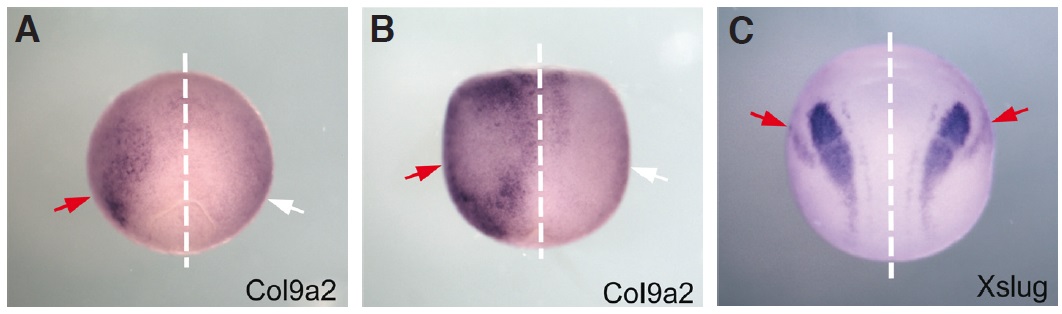 Larger Image Fig. 5. In situ hybridization for collagen9a2 confirms the microarray result of left sided expression prior to nodal flow. (A) Embryos processed by in situ hybridization for the marker col9a2 show expression only on the left side or (B) on both sides but with a strong left bias. Embryos were examined prior to the development of ciliary flow. (C) Control embryos probed for the marker Xslug, which was not biased in the microarray results, showed bilateral symmetric expression in all animals examined. Red arrows indicate areas of expression; white arrows indicate absence of expression. The dotted line demarcates the embryoâs midline. All panels show a dorsal view, with the anterior pointing upward. Image published in: Vandenberg LN et al. (2014) Copyright © 2014. Image reproduced with permission of the Publisher, University of the Basque Country Press.