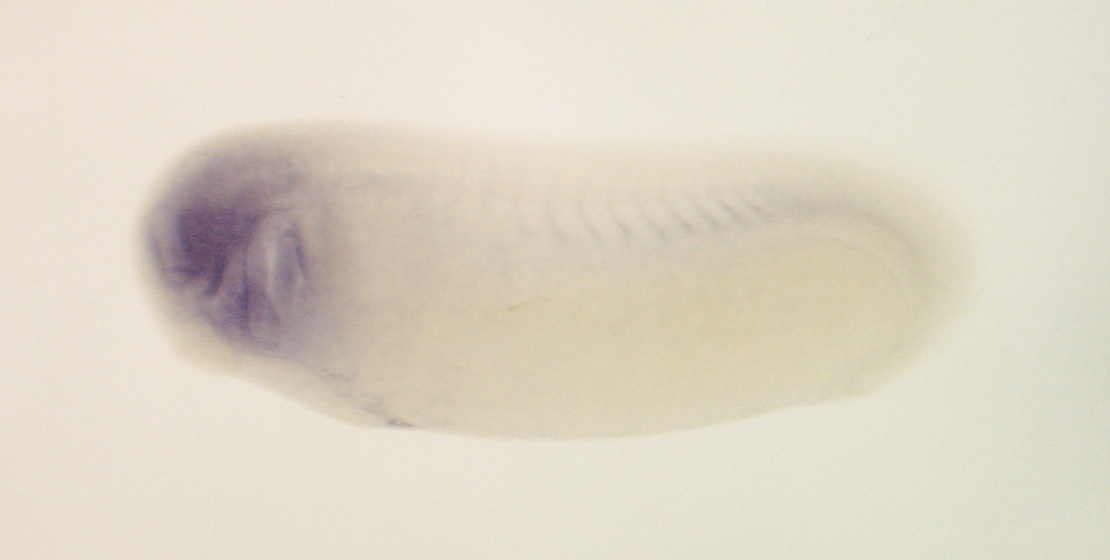 Larger Image gp9 (glycoprotein IX (platelet)) gene expression in Xenopus laevis embryo, assayed via in situ hybridization, NF stage 25, lateral view, anterior left, dorsal up. Copyright © Patient Lab Image created by: Aldo Ciau-Uitz