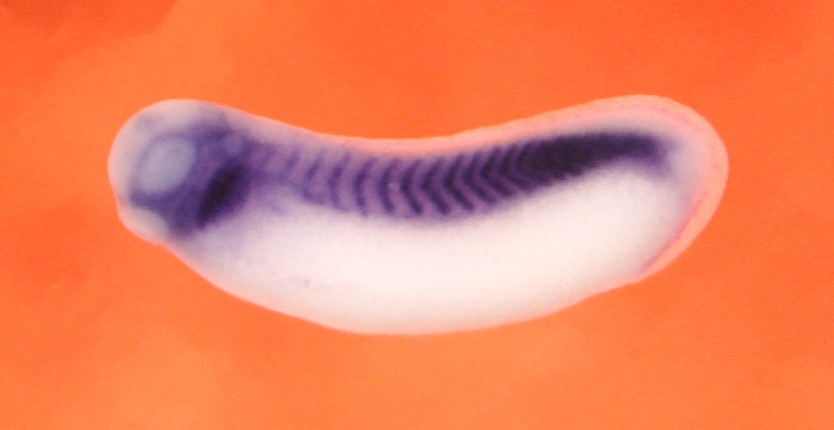 Larger Image egflam (EGF-like, fibronectin type III and laminin G domains) gene expression in Xenopus laevis embryo, assayed via in situ hybridization, NF stage 30, lateral view, anterior left, dorsal up. Copyright © Patient Lab Image created by: Aldo Ciau-Uitz