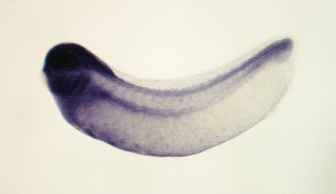 eda (ectodysplasin A) gene expression in Xenopus laevis embryo, assayed via in situ hybridization, NF stage 31, lateral view, anterior left, dorsal up.