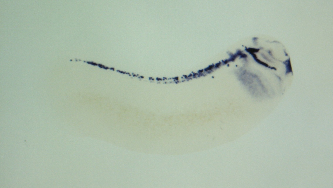 Larger Image ntrk2 (neurotrophic tyrosine kinase, receptor, type 2) gene expression in Xenopus laevis embryo, assayed via in situ hybridization, NF stage 28, lateral view, anterior right, dorsal up. Copyright © Patient Lab Image created by: Aldo Ciau-Uitz