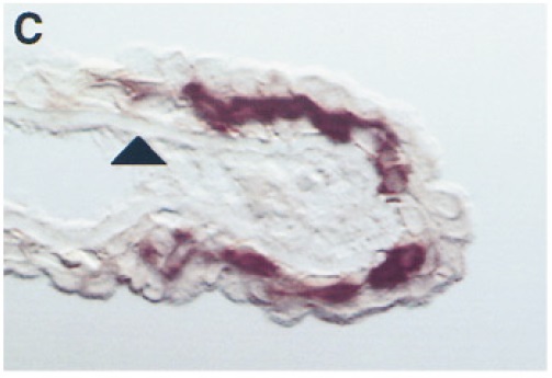 Larger Image krt6 (keratin 6) gene expression in Xenopus laevis embryo, assayed via in situ hybridization, coronal section of NF stage 62, dorsal right. Image published in: Furlow JD et al. (1997) Copyright © 1997. Image reproduced with permission of the Publisher, Elsevier B. V.
