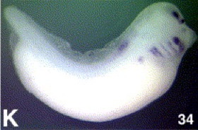 Larger Image tshz1 (teashirt zinc finger homeobox 1) gene expression in Xenopus laevis embryo, assayed via in situ hybridization, NF stage 33 & 34, lateral view, anterior right, dorsal up. This image is extracted from figure published in: Koebernick K et al. (2006), Image published in: Koebernick K et al. (2006) Copyright © 2006. Image reproduced with permission of the Publisher, Elsevier B. V.