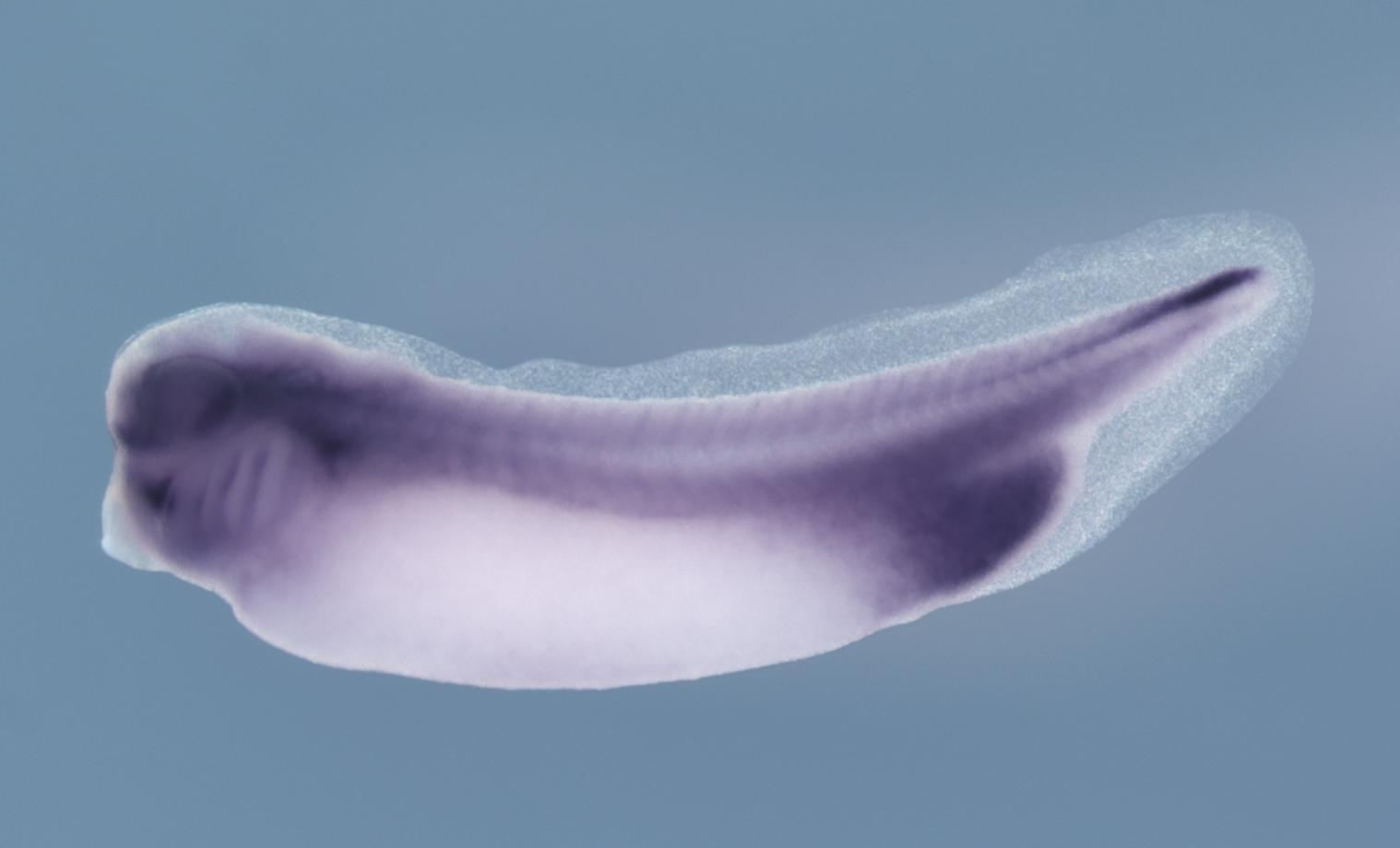Larger Image foxd1 (forkhead box D1) gene expression in Xenopus laevis embryo, assayed via in situ hybridization, NF stage 33, lateral view, anterior left, dorsal up. Copyright © Soeren S Lienkamp Image created by: Soeren S Lienkamp