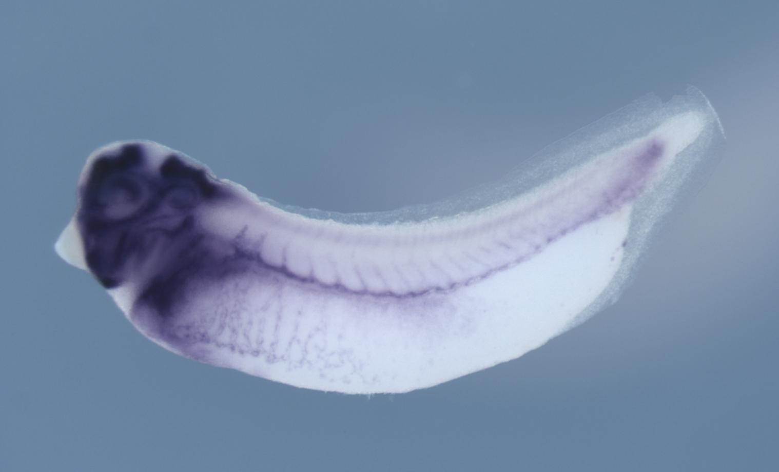 Larger Image nr2f2 (nuclear receptor subfamily 2 group F member 2) gene expression in Xenopus laevis embryo, assayed via in situ hybridization, NF stage 33 & 34, lateral view, anterior left, dorsal up. Copyright © Soeren S Lienkamp Image created by: Soeren S Lienkamp